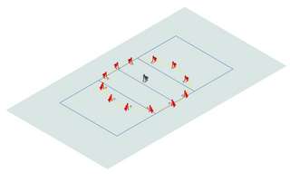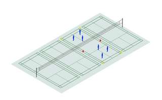 Für diese Übung braucht es 3er-Gruppen. 2 SuS stehen mit dem Ball am Netz, das 3. Kind im Feld. Der Ball wird nun in einer Art Rundlauf immer dem Gegenüber zugespielt und sofort dem gespielten Ball hinterhergelaufen, um die Seite zu wechseln. Der Ball kann auf verschiedene Arten gespielt werden: