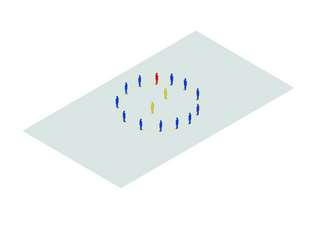 Die Kinder bewegen sich zur Musik um die im Raum verteilten Stühle herum. Beim Musikstopp ruft die Lehrperson, wie sich die Kinder hinstellen sollen: vor, hinter, neben (evtl. rechts/links), unter, auf den Stuhl oder zwischen zwei Stühle.
