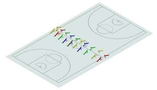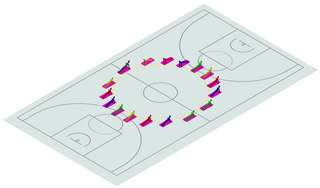 • Beine gegrätscht und auf der Seite dehnen, Reifen über dem Kopf (siehe blaue Figur auf dem Hallenplan)