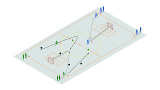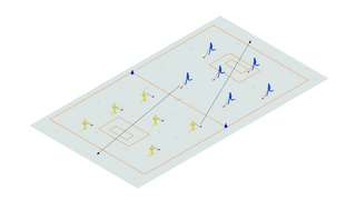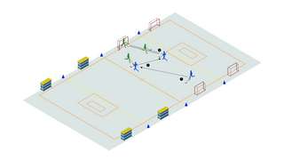 Die Halle wird halbiert und die Klasse in vier Teams, je zwei pro Hälfte, aufgeteilt. Zwei von Team A stellen sich neben das Tor und zwei von Team B in den Mittelkreis. Mit einem Pass in den Mittelkreis eröffnet ein Kind der Gruppe A das Spiel. Nun versucht Team B zu scoren und Team A dies zu verhindern. Das Spiel endet mit einem Tor von Team B oder mit Ablauf der Zeit. Neue Teammitglieder nehmen die Plätze ihrer Vorgänger*innen ein und das Ganze beginnt von vorn. Nach 5 Minuten wird getauscht; A greift an und B verteidigt. Durch Überzahl des Angreifer- oder Verteidigerteams kann die Übung variiert werden.