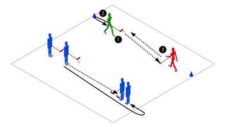 Der Klassiker schlechthin unter den Unihockey-Übungen: Die Klasse wird zuerst auf je eine Hallenhälfte aufgeteilt. Anschliessend stellt sich jeweils eine Schülerin in eine, ein Schüler in die andere Ecke der Hallenhälfte. Die Spielerin läuft bis zur Markierung, dreht sich zum Mitspieler und fordert einen Steilpass. Die Schülerin versucht, den Ball anzunehmen, mit ihm zu laufen und dann erfolgreich abzuschliessen. Der Schüler, welcher den Pass gespielt hat, wird nun zum Läufer und an seine Stelle tritt das nächste Teammitglied. Wahlweise kann die Übung durch den Einsatz von Verteidiger*innen oder Torhüter*innen erschwert werden.