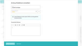 Für eine Entwurfslektion sind zwei Angaben erforderlich: Titel und die Auswahl des Kompetenzbereichs. Unter «Persönliche Notizen» besteht die Möglichkeit, Anmerkungen zu notieren, Links einzubetten oder Dateien (z.B. Bilder) hochzuladen. Sind alle Angaben gemacht, kann der Entwurf gespeichert werden. Diese Schritte wiederholt ihr für ganze Quartale o.ä., um schnell und einfach eine Grobplanung fertig zu stellen. Durch die Auswahl des Kompetenzbereichs erhält die Entwurfslektion direkt die entsprechende Farbe. Dadurch erkennen die Lehrpersonen auf einen Blick, an welchen Kompetenzen sie mit ihren Schülerinnen und Schülern arbeiten.