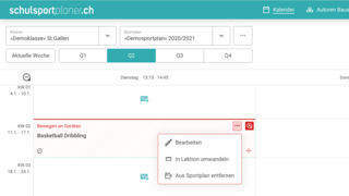 Die Entwurfslektionen werden im Kalender mit schraffiertem Hintergrund angezeigt, während reguläre Lektionen durchgehend eingefärbt sind. Ein Entwurf kann mit einem Klick in eine Lektion umgewandelt werden. Dafür einfach in der Kalender-Ansicht mit der Maus die drei Punkte in der rechten oberen Ecke anklicken, «In Lektion umwandeln» auswählen – fertig.